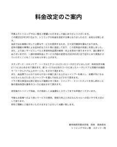 この度2022年5月1日より料金の改定がございますのでご案内と共にお知らせさせて頂きます。